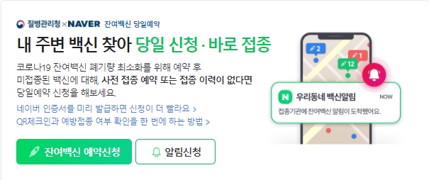 예방접종 사전예약 시스템 외에도 네이버(모바일 앱 또는 PC 검색창에 '잔여백신예약'입력)나 카카오톡(하단 '#'버튼 클릭 후 상단 '잔여백신'클릭), 카카오 맵에서 사전 예약이 아닌 간편하게 잔여백신을 당일 예약해 접종할 수 있는데요.